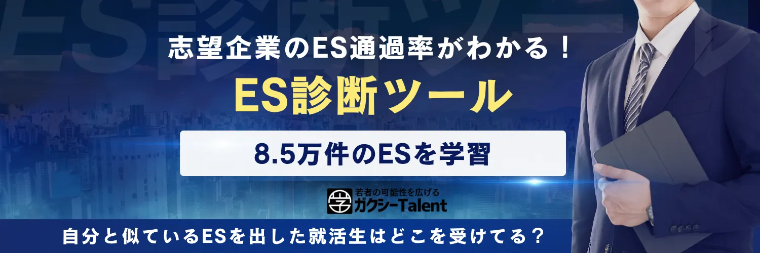 「ES診断ツール」は、85,000件の選考通過ESデータとAI分析技術を活用した、就活生向けの無料診断サービスです。学生が書いたESを入力すると、過去の通過者データと照合し、通過しやすい企業の提案や志望企業との相性度を即座に分析。さらにAIが類似ESとの比較分析を行い、具体的な改善ポイントを提示。データドリブンな就活支援で、書類選考突破への道筋を明確化します。